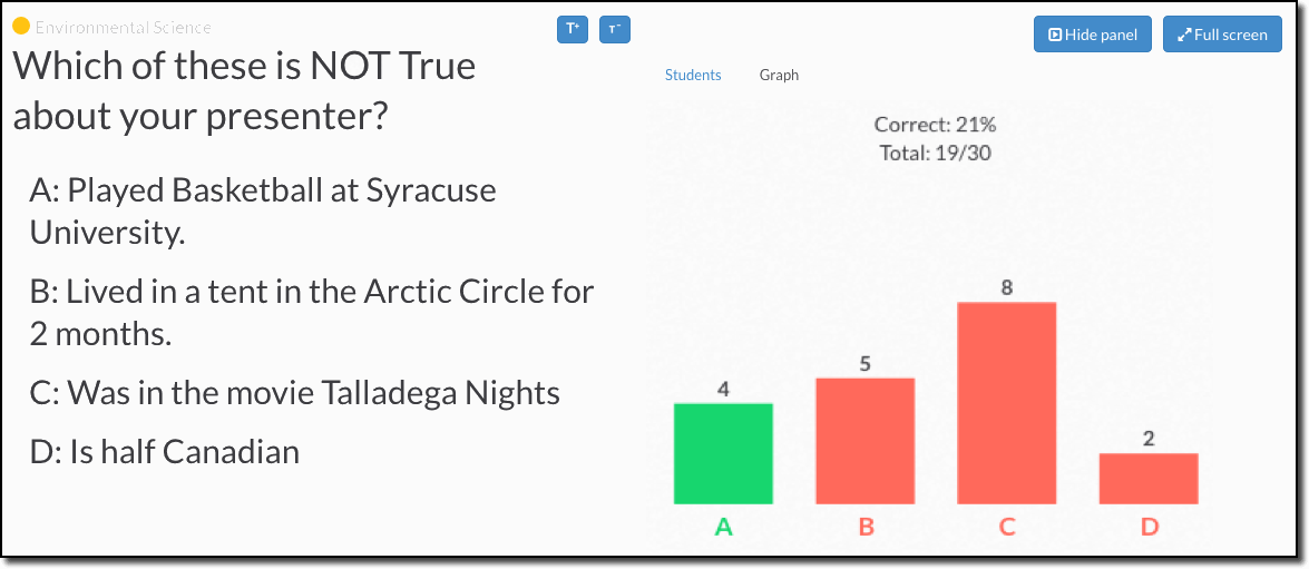 Student answers are displayed in real time beside the question. You can view them by card number, student name, or as a bar graph. You can click “Reveal Answer” after all cards are scanned to display the correct answer among all student answers. You can also hide student responses from view and just display the question by selecting “Hide Panel.”