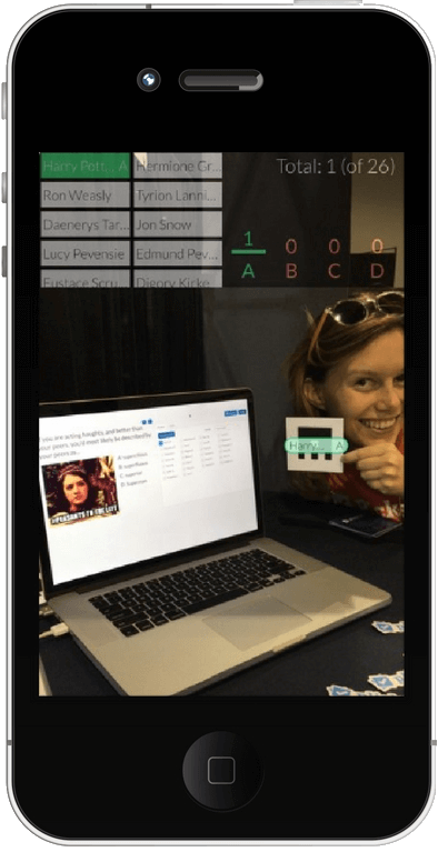 The app view rocks! Student names will be displayed in front of them in green (correct answer) or red (wrong answer) as you scan them.